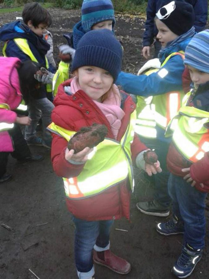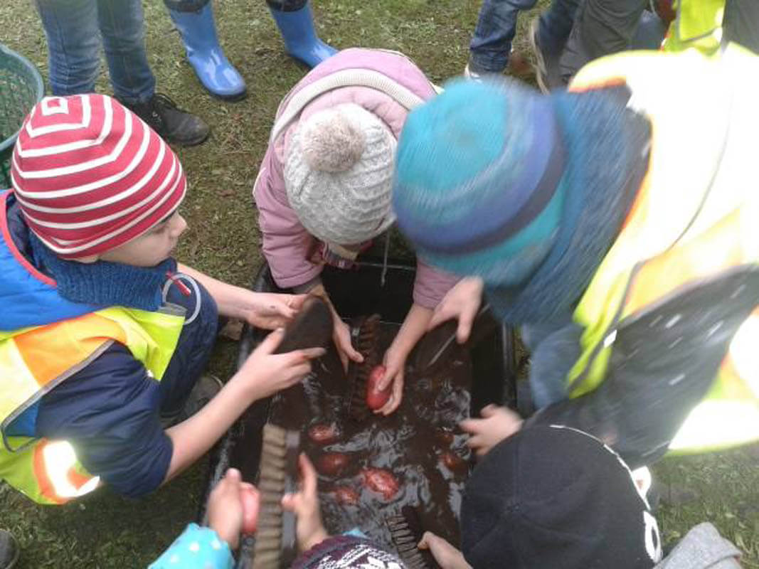 Wir waren im November in der Gartenarbeitsschule und haben dort die letzten Kartoffeln des Jahres geerntet. Während die Kartoffeln über dem Feuer gekocht wurden, haben wir Apfelsaft gepresst. Anschließend haben wir alles mit viel Appetit verspeist. Hmmmm….!