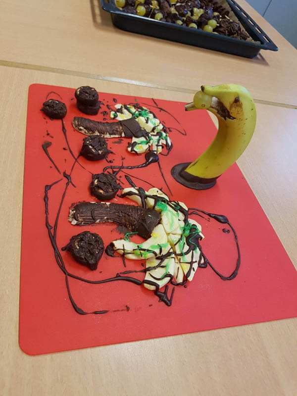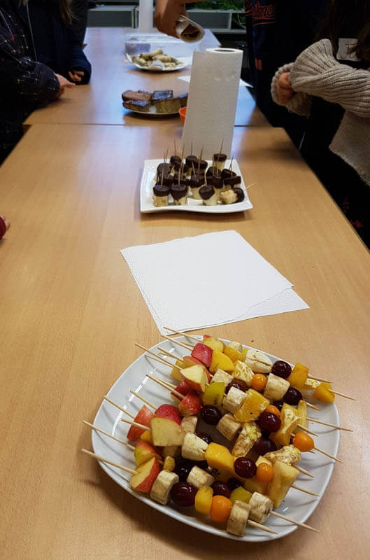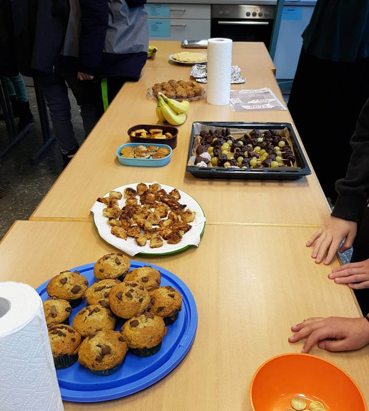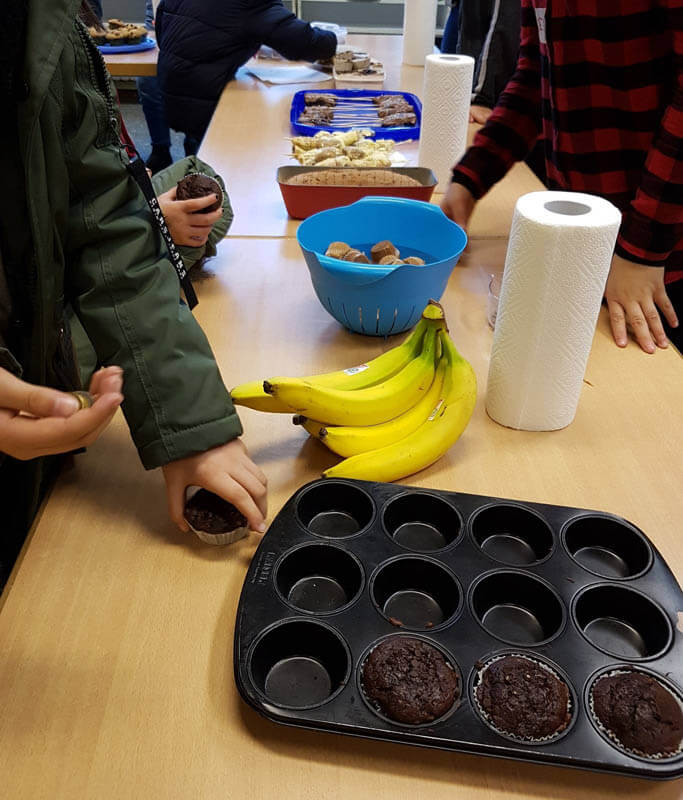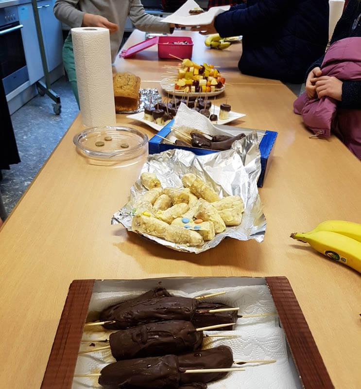 Im Januar haben wir uns im Sachunterricht mit der Bananenpflanze, ihren Herkunftsländern und dem Weg der Banane zu uns in den Supermarkt beschäftigt. Zu Beginn haben wir auf dem Wochenmarkt auf dem Karl-August-Platz die Verkäufer nach einigen Informationen zu den Bananen befragt. Zum Abschluss der Reihe haben wir einen Kuchenbasar unter dem Motto “Alles Banane” veranstaltet. Dafür wurde vorher zu Hause fleißig gebacken – mit einer Bedingung: die Banane musste eine Zutat sein. Wir konnten karibisches Bananenbrot, Bananencrepes, Bananencookies, Bananenmuffins, Honigbananen, Schokobananen und Obstspieße anbieten. Durch die großartige Unterstützung der Eltern und aller Schülerinnen und Schüler der 4b ist der “Alles Banane” Verkauf ein voller Erfolg geworden und so wird auch nicht nur uns dieser Tag lange in Erinnerung bleiben.