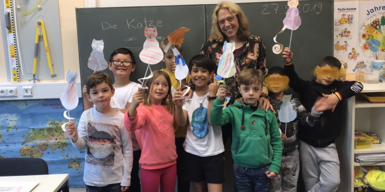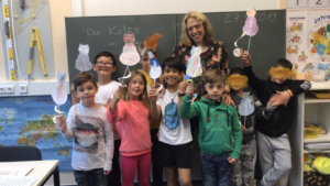 Als wir verschiedene Tiere im Unterricht durchnahmen, ergab sich lustigerweise, dass fast jedes Kind eine oder sogar mehrere Katzen zuhause oder am (ehemaligen) Heimatort hat und diese Tiere besonders mag. Insgesamt haben wir 12 Katzen gezählt, die wir alle zusammen besitzen. Wir haben die Tiere näher beschrieben („Fell, Tatzen, Schnurrhaare etc) und Exemplare aus Papier und Strohhalmen gebastelt. Die Kinder haben die Wörter für „Katze, Tiger, Leopard und Löwe“ in ihrer eigenen Sprache genannt und miteinander verglichen. Anschließend haben wir den selbst gebastelten Tieren die Namen unserer echten Hauskatzen gegeben und sie einander vorgestellt: wie sehen sie aus, was fressen sie gern, wie ist ihr Charakter etc…. Alle hatten sehr viel Spaß!