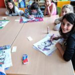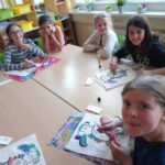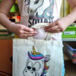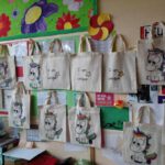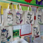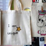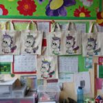 Diverse Baumwolltaschen vorgemalt, Stoffmalstifte und Entwürfe für alle interessierten Einhorn Fans vorbereitet und los geht es…
