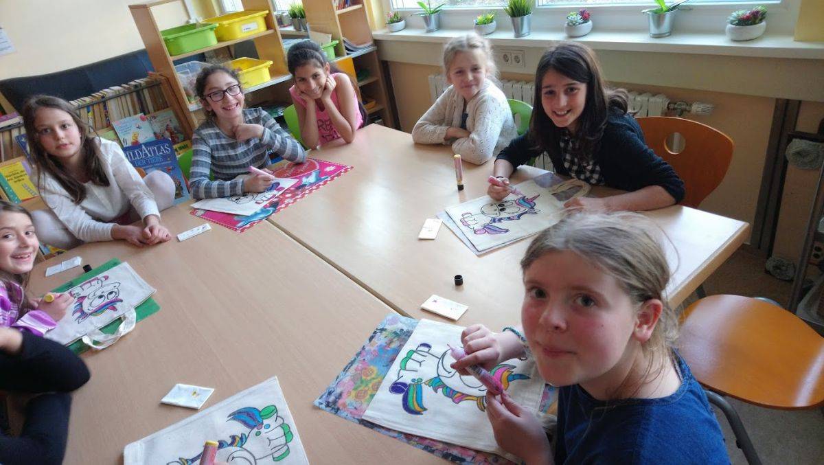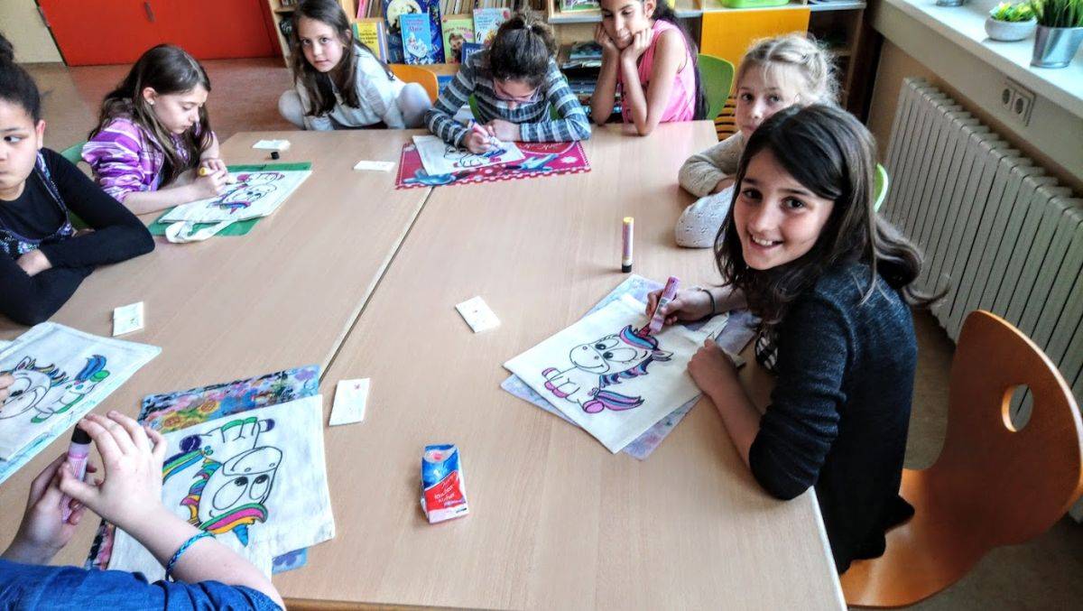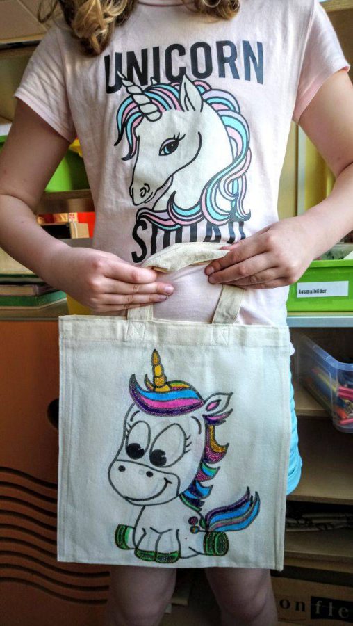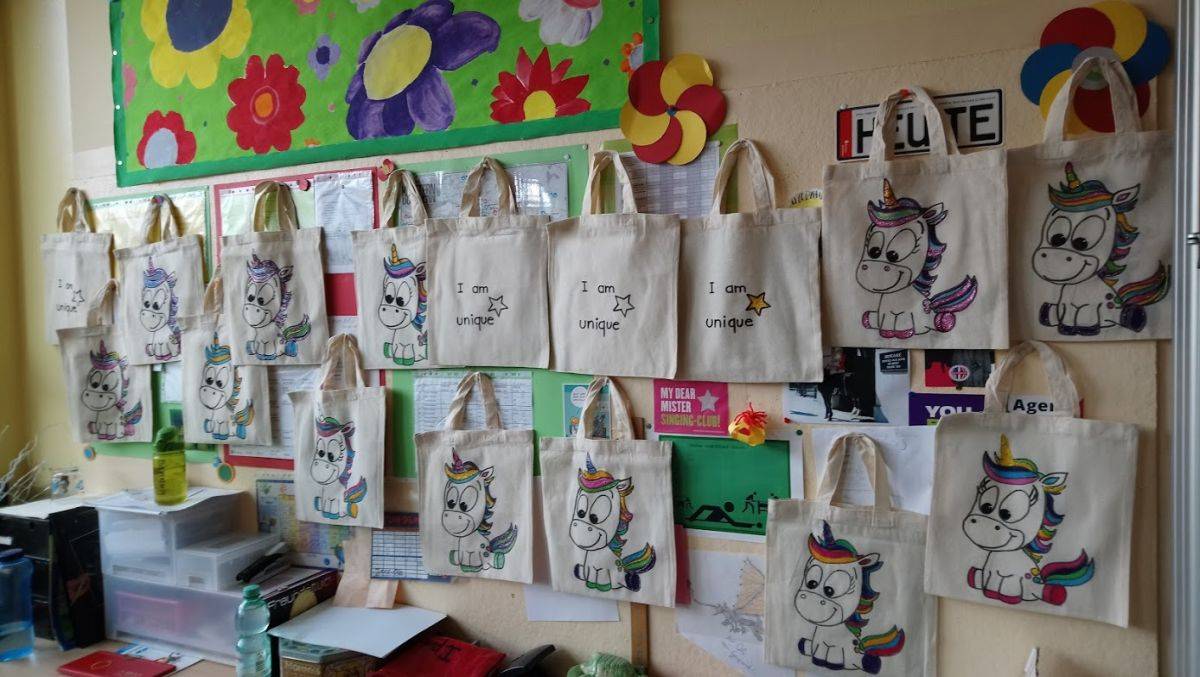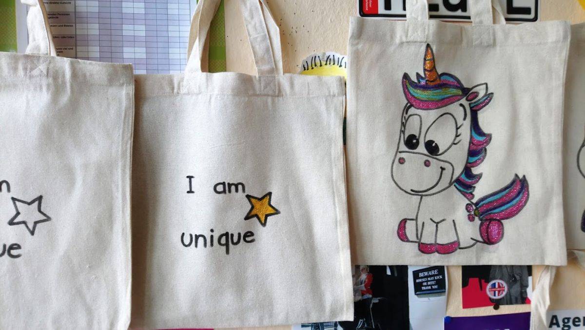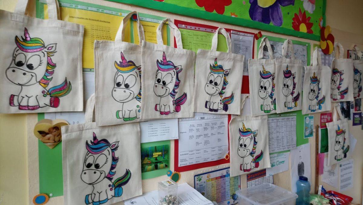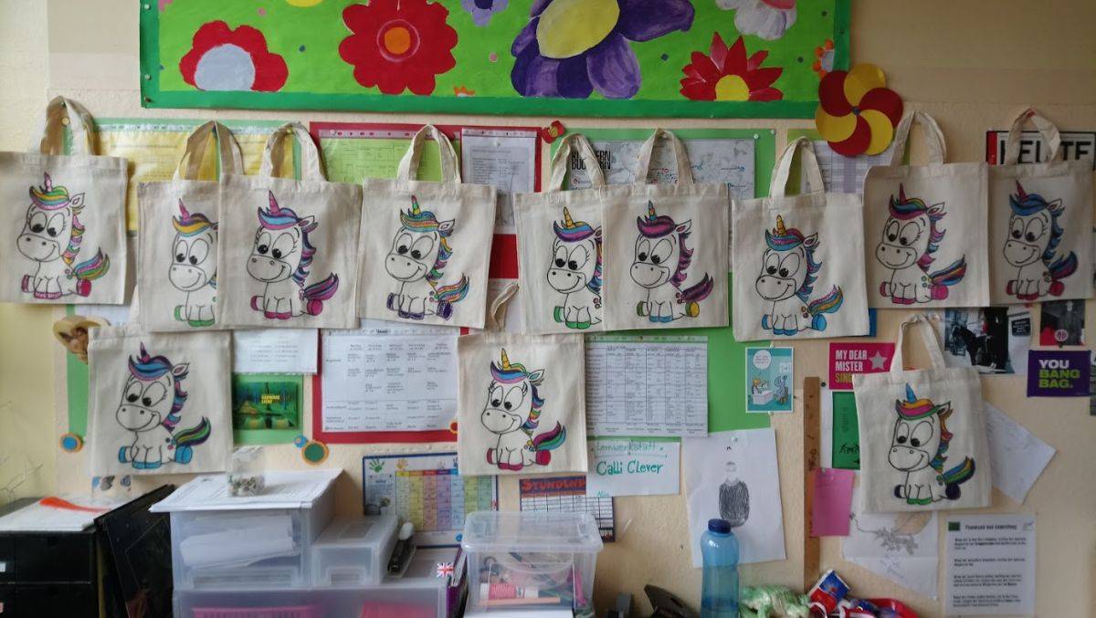 Diverse Baumwolltaschen vorgemalt, Stoffmalstifte und Entwürfe für alle interessierten Einhorn Fans vorbereitet und los geht es…