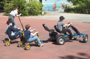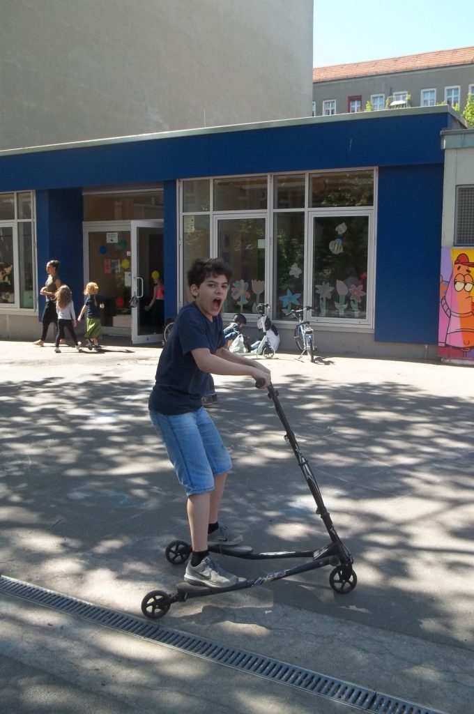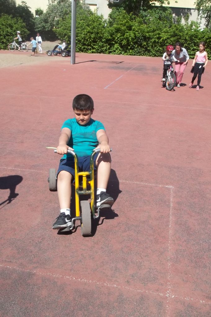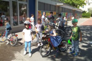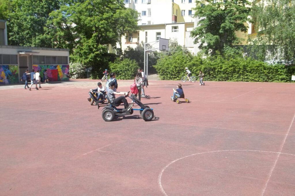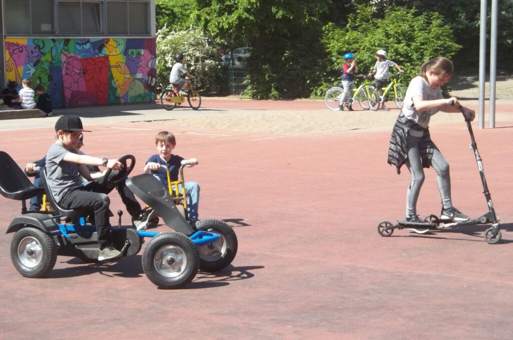 Am Montag und Freitag jeder Woche ist ab 14.00 Uhr Fahrzeugtag im Hort. Diese Tage stehen unter dem Motto „Alles, was rollt“. Die Kinder dürfen mit ihren selbst mitgebrachten Fahrzeugen, seien es Fahrräder, Roller, Waveboards und Inlineskatern, auf dem Hof fahren. Der Hort stellt fünf eigene Fahrräder, zwei Dreiräder, zwei Kettcars und einen Roller nebst eigenen Helmen zur Verfügung. Gerade an diesen Tagen wird natürlich auf das Tragen von angemessener Schutzausrüstung geachtet. Die Kinder freuen sich auf die Fahrzeugtage und haben, wie an den Bildern zu sehen ist, einen Riesenspaß.